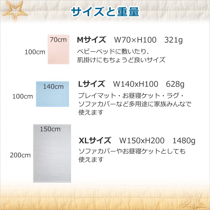 Lサイズはプレイマットやお昼寝ケットなどにちょうど良いサイズです。