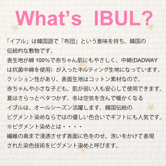 イブルはキルティングの一種。プレイマット・お昼寝ケット・ラグ・ソファカバーなど多用途に家族みんなで使えます。
